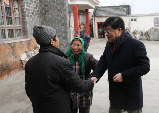 2月25日,徐镜人董事长在工作人员的陪同下来到引江村因病致贫的张龙海家。在周围新瓦房的映衬下,张龙海家二十多年前建的老房子显得非常破旧。因为肝脏疾病,张龙海已经多年不能劳作,全家主要收入就是他妻子微薄的工资。张龙海的药费,女儿的学费,一家人的生活负担都让这个家庭面临困境。一进到院子里,张龙海的母亲就拉住徐镜人的手,连声称谢,感谢扬子江为他们雪中送炭。作为帮扶对象,扬子江为张龙海购买了新农保,保障他看病就医,还资助他女儿上大学。徐镜人关切地与张龙海进行交谈,详细了解他的身体情况、看病情况和家庭收入。